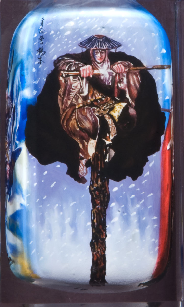 天暗星青面兽 杨志 Yang Zhi Yáng Zhì (楊志), nicknamed the 'Blue-Faced Beast' (青面兽), had incredible ability as a warrior was a major character of the epic Chinese tale, the Water Margin. He was one of the most talented warriors of Liangshan. Yang Zhi stood at about 7 feet, had a blue birthmark on his face (accounting for his nickname), and red whiskers growing out from the sides of his face. Also, Yang Zhi was a descendant of Yang Jiye, a famous Song general. He managed to secure an official position and was assigned to escort a convoy of goods but he lost the goods while crossing the river. He dared not return and report to his master. Yang managed to scrape some money to repay the goods he lost, as well as continue on with his official position. On the way back, he passed by Liangshan Marsh and had a fight with Lin Chong, but was stopped by Wang Lun. Wang tried to persuade Yang Zhi to join the Liangshan band but Yang refused. Yang Zhi returned to the capital city to report to Gao Qiu, the high-ranking corrupt Song official. Gao reprimanded Yang Zhi fiercely for losing the goods and chased him out of the residence. Yang became penniless and wandered around the city, trying to sell a precious sabre handed down from his ancestors. He was harassed by a hooligan named Niu Er, and Yang killed Niu in a fit of anger. He was exiled to Damingfu, Beijing. At Damingfu, Grand Secretary Liang recognised Yang's abilities and wanted to give him a post. Suo Chao objected to the decision and challenged Yang Zhi to a contest. Neither of them won the opponent in the contest. Liang decided to give Yang an official post eventually. Liang treated Yang well and gave him an important task; Yang Zhi was to escort a convoy of birthday gifts to Dongjing, for Liang's father-in-law, Cai Jing. Yang and his soldiers disguised themselves as traders so as not to arouse suspicion from bandits. At Huangni Ridge, Chao Gai and his companions robbed the birthday gifts after making Yang and his soldiers unconscious with drugged wine. Yang dared not return to Damingfu after having failed his mission. He was very upset and went to Cao Zheng's restaurant for a meal without paying. Cao fought with Yang and after that did they realise who each other were. Cao Zheng, Yang Zhi and Lu Zhishen killed Deng Long and took control of the stronghold on Erlong Mountain. After the battle of Qingzhou, Yang Zhi followed the Liangshan heroes to Liangshan. Yang Zhi became one of the 8 vanguard generals of the Liangshan cavalry and 36 Heavenly Chieftains. He followed the heroes on their campaigns against the Liao Tartars and the southern rebels. During the Fang La campaign, Yang Zhi died of illness after Dantu Prefecture was conquered. Information from Wikipedia. Bottle painting by Li Yaming |