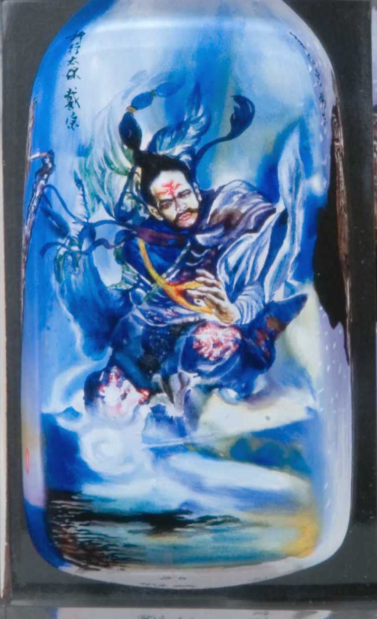 天速星神行太保 戴宗 Dai Zong Dai Zong served as a jailer in Jiangzhou.He had a wide face, squarish mouth and a lean body. He had a special magic ability which enabled him to travel over long distances. To travel 500 li, he would require two talismans tied onto his legs. To travel 800 li, he would require four talismans. Due to this ability, he was nicknamed the 'Magic Traveller'(神行太保). Dai Zong was a good friend of Wu Yong, and when Song Jiang was exiled to Jiangzhou, Dai took good care of Song after reading the letter Song brought with him from Wu Yong. In Jiangzhou, Song Jiang wrote a poem urging rebellion against the government in a drunken state and was arrested. Dai Zong suggested to Song Jiang that he act like a lunatic. Huang Wenbing sensed that Song Jiang was not insane at all and suggested that Song Jiang be tortured. Dai Zong tried his best to help Song Jiang but could not. Cai Jiu sent Dai Zong to the capital city, but Dai went to Liangshan for help instead. Wu Yong came up with a plan and invited Xiao Rang and Jin Dajian to help. Xiao Rang forged a letter by Cai Jing and Jin Dajian came up with a seal similar to Cai Jing's. In the letter, it was stated that Song Jiang was to be released immediately. Dai Zong returned with the letter to Jiangzhou and handed it to Cai Jiu. Unfortunately, Huang Wenbing discovered the forgery as Jin Dajian had made a mistake. Cai Jiu was furious and had Dai Zong arrested as well. Both Song Jiang and Dai Zong were scheduled to be executed, but the Liangshan heroes stormed the execution ground and rescued them. Once, Song Jiang contracted an illness due to a growth on his back, and was in a critical situation. Zhang Shun went to find An Dao-quan, the famous doctor, and Dai Zong transported An swiftly back to Liangshan with his magic power. Thus, Song Jiang was saved in time. Dai Zong became the overall-in-charge of the Liangshan scouting team, which gathered information from the enemy. During the battle against the Zeng Family Village, Dai made a great contribution by speeding towards the village twice and back, bringing with him news of the situation, paving the way for victory. Dai followed the heroes on their campaigns against the Liao Tartars and southern rebels. He was one of the few lucky surviving heroes after the campaigns. He was given the an official post in Yanzhou. However, he resigned and went to a temple where he led a reclusive life. Months later, Dai died after laughing non-stop. Information from Wikipedia. Bottle painting by Li Yaming |