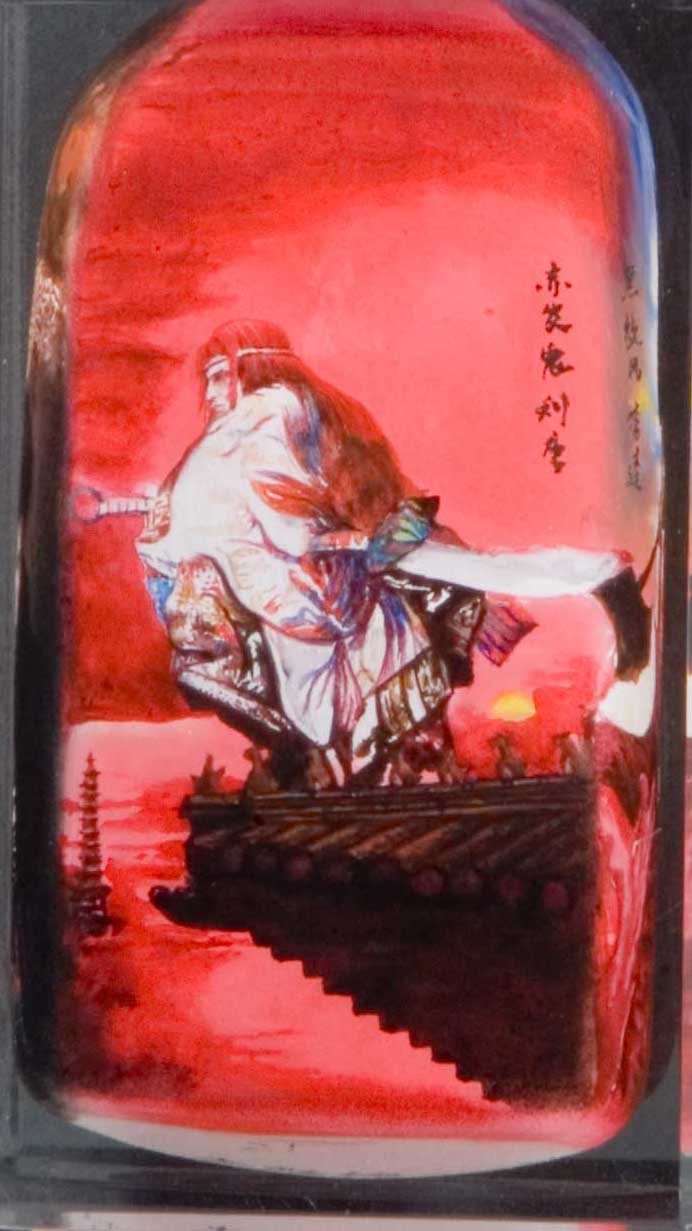 天异星赤发鬼 刘唐 Liu Tang Liu Tang was from Dongluzhou. He had a dark complexion, a wide face, with a red birthmark on the side of his face, with strands of yellow hair growing out from the birthmark. Thus he was nicknamed the 'Red-Haired Devil' (赤发鬼). He had a muscular body, and excelled in using the sabre. Liu Tang was the first person to hear about the convoy of birthday gifts for Cai Jing, which was being escorted by Yang Zhi and his soldiers. He rushed off immediately to tell his friend, Chao Gai, but got too drunk on the way and fell asleep inside a temple. The constable Lei Heng arrested Liu Tang, mistaking him for a wanted bandit. Luckily, Chao Gai lied to Lei Heng that Liu Tang was his nephew, asking for Liu Tang's release. Lei Heng kindly obliged. Liu Tang, Chao Gai, Wu Yong, Gongsun Sheng and the three Ruan brothers disguised themselves as traveling traders and at Huangni Ridge, they drugged Yang Zhi and his soldiers with wine from Bai Sheng. Then, they escaped with the birthday gifts worth a huge sum. He Tao led government troops with him to arrest the seven men, but was defeated by them. Chao Gai and his friends sought refuge on Liangshan after that. On Liangshan, Wang Lun refused to allow the seven men join his band. Lin Chong killed the weak and incompetent Wang Lun after Wu Yong's urging. Chao Gai then became the chief of the Liangshan heroes, with Liu Tang in the 5th position. Chao Gai wanted to thank Song Jiang for informing them about the danger, and sent Liu Tang with a hundred gold pieces to thank him. However, the gold pieces became the cause for Song Jiang killing Yan Poxi. Song Jiang was arrested and exiled to Jiangzhou, where he got into deeper trouble by writing a poem urging rebellion against the government. The Liangshan heroes stormed the execution ground and rescued Song Jiang, who was about to be executed. In the battle of Dongchangfu, Liu Tang fought with Zhang Qing, the 'Featherless Arrow' but was stunned by Zhang's stones and fell off his horse. Liu Tang was captured by Zhang Qing and thrown into prison. Later, the Liangshan heroes conquered Dongchangfu and rescued Liu Tang. Liu Tang became one of the leaders of the Liangshan infantry and 36 Heavenly Spirits and followed the heroes as they went on expeditions against the Liao Tartars and southern rebels. During the Fang La campaign, Liu Tang was assigned to attack the Houchao Gate of Hangzhou. He saw that the gates were wide open, and so he charged in, not knowing it was a trap. Liu Tang was killed by a falling beam from the gate. Information from Wikipedia. Bottle painting by Li Yaming |