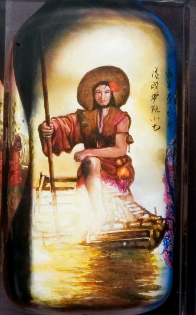 天败星活阎罗阮 小七 Ruan Xiaoqi Ruan was born with an unusual appearance, with bulging eyes and light yellow whiskers, with dark patches on his skin, as though he was cast in bronze. Thus, he earned the nickname 'Living King Yama' (活阎罗). Ruan Xiaoqi and his two elder brothers Ruan Xiaoer and Ruan Xiaowu in Shijie village as fishermen. All three of them were known to be powerful swimmers. Ruan Xiaoqi loved gambling and often gambled all his money away. He was a straightfoward and impatient man. Wu Yong succeeded in persuading the Ruan brothers to join the four of them(Chao Gai, Wu Yong, Gongsun Sheng and Liu Tang), to rob the convoy of birthdays gifts. Later, the whole incident was exposed and the seven men were ordered to be arrested. Song Jiang informed Chao Gai that he was wanted, thus Chao and his friends escaped in time to Liangshan for refuge. Wang Lun, the incompetent leader of the Liangshan band refused to allow the heroes to join the band, but was killed by Lin Chong. Then, Chao Gai was elected to be the new leader. Ruan Xiaoqi then took the 8th position among the heroes. Ruan joined in the attack against Huang An, the rescue mission in the Jiangzhou execution ground and many other adventures. Once Zhang Heng was caught by Guan Sheng, Ruan tried to sneak into Guan's camp to rescue Zhang but was also caught. After the heroes had defeated Guan Sheng, the captives were then released. Ruan Xiaoqi became one of the leaders of the Liangshan navy and 36 Heavenly Spirits, along with his brothers and made contributions during the expeditions against the Liao Tartars and southern rebels. His brothers were not as lucky as him as both of them perished in the Fang La campaign. After the Liangshan heroes had defeated Fang La, Ruan Xiaoqi donned Fang La's crown and robes in fit of excitement. Later, Ruan Xiaoqi was rewarded with an official position, but the evil officials reported him to the emperor. The emperor was furious with Ruan Xiaoqi for donning Fang La's garments as that was considered an act of rebellion so Ruan was dismissed from office and became a commoner. He went home and lived a happy life till his death at the age of 60. Information from Wikipedia. Bottle painting by Li Yaming |
