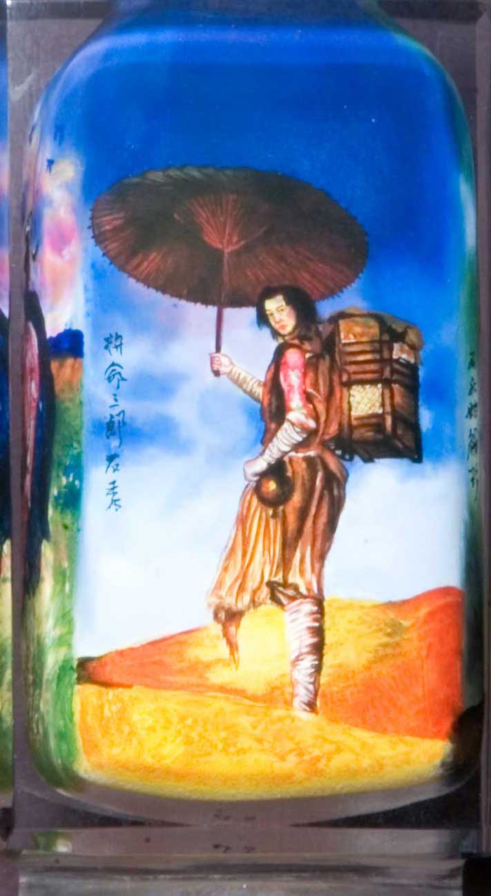 天慧星拚命三郎 石秀 Shi Xiu Shi Xiu's ancestors were from Jinling Jiankangfu, presently Nanking. He and his uncle made their living by travelling around and trading. Unfortunately, Shi's uncle died, and Shi Xiu made a great loss. He had no money to travel home, so he wandered around in Jizhou, selling firewood for a living. Since young, Shi Xiu had been trained in martial arts, and was a brave and straightforward man who helped those in need, thus he was nicknamed the 'Daredevil Third Brother (拼命三郎)'. Despite Shi Xiu's nickname and his humble nature, he was extremely acute and intelligent. During the Zhu family invasion, Shi Xiu successfully escaped capture by befriending an old man, whom he rescued after the battle. He was much more capable than merely a 拼命三郎. Once, Shi Xiu came across a group of hooligans, who were beating up Yang Xiong. He immediately went to Yang's aid and managed to chase off the hooligans. Yang thanked Shi for his help and the two felt a special affection towards each other, so they became sworn brothers. Yang brought Shi home with him and allowed Shi to work as a butcher in his stall. Shi Xiu discovered that Yang Xiong's wife had committed adultery with a monk and went to inform him. Yang Xiong, however, believed his wife and accused Shi Xiu of molesting his wife. Yang drove Shi Xiu away in a fit of anger. Shi Xiu was unhappy and killed Pei Ruhai, the adulterer. He showed Yang the evidence and Yang brought his wife to Cuiping Mountain, where he questioned her. Yang discovered the truth and realised he had wronged Shi Xiu, so he killed his wife and the two sworn brothers left for Liangshan. Shi Qian, who had been watching the scene secretly, appeared and wanted to join the duo on their journey to Liangshan. The trio passed by the Zhu Family Village along the way, where Shi Qian stole a chicken and was caught by the Zhus. Yang Xiong and Shi Xiu fled to Liangshan for help. Song Jiang led the Liangshan forces on their assault on the Zhu Family Village, but was defeated. Then, he managed to secure help from Sun Li, who acted as a conspirator from within the Zhu Family Village. In order to prove his loyalty to the Zhus, Sun Li captured Shi Xiu. Later, Sun Li and the Liangshan forces conquered the Zhu Family Village. Shi Xiu became one of the leaders of the Liangshan infantry and one of the 36 Heavenly Chieftains. After Song Jiang had obtained amnesty from the government, Shi followed the heroes on their campaigns against the Liao Tartars and southern rebels. During the Fang La campaign, Shi Xiu was killed in an ambush at Yuling Pass by Pang Wanchun's archers. Information from Wikipedia. Bottle painting by Li Yaming |