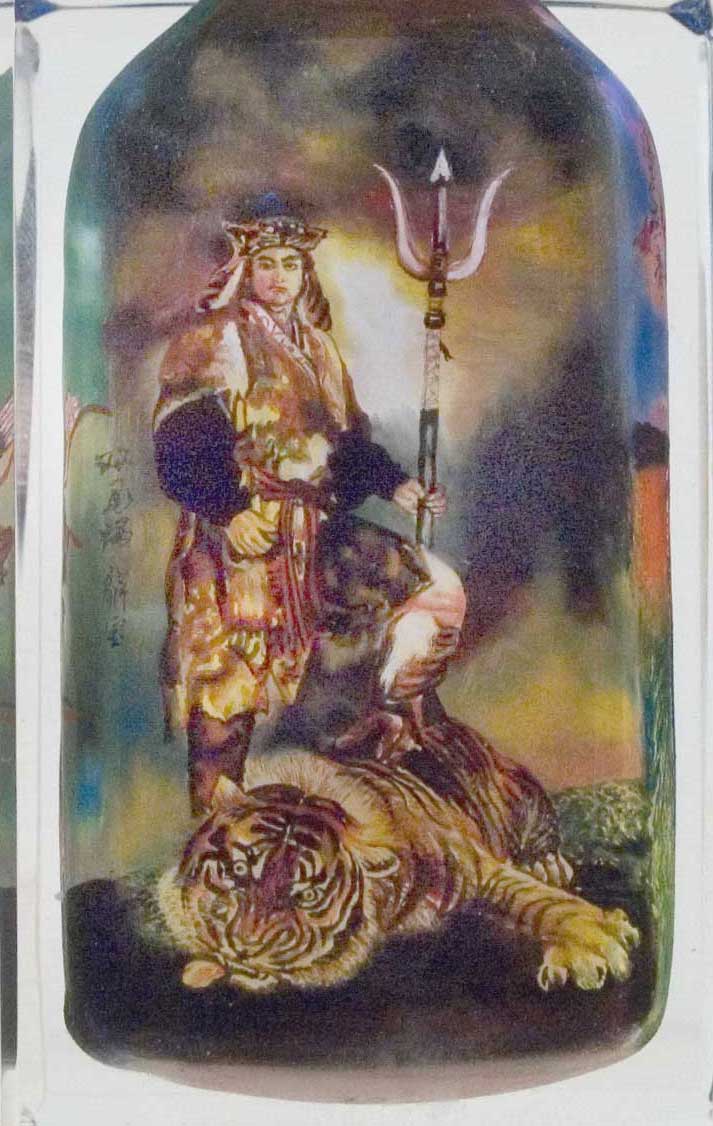 天哭星双尾蝎 解宝 Xie Bao Xie Bao (解宝) was a character in the Water Margin. Xie Bao and his brother Xie Zhen were rated as top hunters in Dengzhou. Xie stood at 7 feet, had a round face and a dark complexion. He had a pair of flying yaksha tattoos on his legs, and dressed in a similar manner to his brother. He was brave and daring, skilled in martial arts and carried a bronze forked spear. He could scale mountains and climb cliffs as well, thus earning him the nickname 'Double-tailed scorpion'(双尾蝎). Once, the Xie brothers were assigned to hunt down a ferocious tiger. The tiger was shot by their poison arrows and landed in Squire Mao's backyard. Squire Mao sent the dead tiger to the county office for his reward and framed the Xie brothers of robbing him. He bribed the county governor, who sentenced the Xie brothers to death. Luckily, Yue He, Sun Li, Sun Xin, Gu Dasao, Zou Run and Zou Yuan raided the prison and rescued the Xie brothers. They killed Squire Mao and his family, then fled to Liangshan. The Xie brothers aided Sun Li as they acted as conspirators within the Zhu Family Village, allowing the Liangshan heroes to conquer Zhu Family Village easily. The brothers eventually joined the bandits officially and were part of the 36 Heavenly Chieftains, and were leaders of the Liangshan infantry. They followed the heroes on their campaigns as they defeated the Liao Tartars and subdued the southern rebels. During the Fang La campaign, the Xie brothers sneaked into Hangzhou and aided the heroes in conquering Hangzhou, making great contributions. Then, the Xie brothers volunteered to act as spies when the heroes were attacking Wulong Ridge. They disguised themselves as hunters and tried to scale the mountain. Enemy troops spotted them, which resulted in Xie Zhen falling to his death and Xie Bao being shot to death by arrows. After that, the enemy troops displayed the bodies of the Xie brothers, trying to lure Song Jiang to attack them, but Song Jiang lost and managed to escape under the protection of the heroes. Information from Wikipedia. Bottle painting by Li Yaming |
