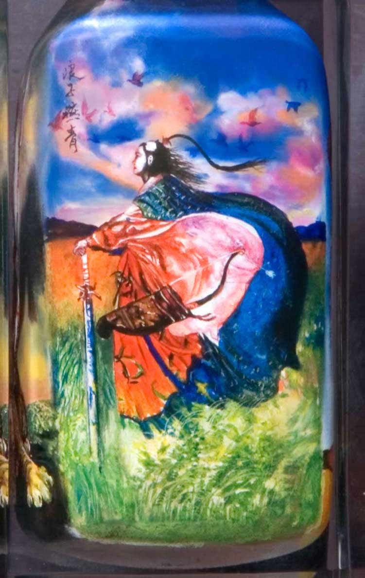 天巧星浪子 燕青 Yan Qing Yan Qing was from Damingfu, Beijing. He lost his parents at a young age and was brought up by Lu Junyi, who allowed Yan to work as a steward in his home. Yan Qing was extremely loyal to Lu Junyi and was Lu's right-hand man. Yan Qing stood at about 6 feet, had a handsome face, red lips and thick eyebrows, with broad shoulders and a narrow waist. His torso was covered with flowery tattoos as a gift from Lu Junyi who took him to see a master tattooist. And because of his pale complexion, the tattoos stood out with magnificent beauty. Yan Qing was also a skilled dresser, dressing both well and on occasion, often aiming to show off his flowery tattoos. Apart from his martial arts, Yan Qing was also an accomplished musician. There was no instrument that he could not play, nor was there no song he could sing. He was a splendid actor who did well to often disguise himself into the roles of others to infiltrate deep into the capital city. Once, Lu Junyi fell for a ruse by Wu Yong was framed by Li Gu, his other steward, and Yan Qing was chased out of the residence. Lu Junyi was then sentenced to be exiled to Shamen Island. The guards escorting him there were bribed to finish him off along the way, but Yan Qing appeared in the nick of time and rescued Lu Junyi. They were surrounded by government troops, and Lu Junyi was caught again. Yan Qing managed to escape to Liangshan and ask for help. The Liangshan heroes attacked Damingfu and rescued Lu Junyi. Yan Qing then became one of the leaders of the Liangshan infantry, and one of the 36 Heavenly Chieftains. Once, Yan Qing went to Taianzhou with Li Kui to challenge a martial artist (wrestler) named Ren Yuan. Yan Qing defeated Ren, who was larger in size than him. Yan and Li created an uproar in Taianzhou, and were almost caught by government troops but escaped. The government attacked Liangshan thrice, but were defeated. Song Jiang hoped to obtain amnesty from the government, so he sent Yan Qing to win favour from Li Shishi. Yan Qing used Li Shishi to help the Liangshan heroes obtain amnesty from the emperor. Yan Qing followed the heroes on their campaigns against the Liao Tartars and southern rebels such as Fang La. He was one of the few lucky survivors after the campaigns, but refused to take up any official post despite his contributions. He then left for a reclusive life, and before leaving, he tried to persuade Lu Junyi to follow him. Once again, Lu ignored Yan's warnings and eventually died a tragic death at the hands of the evil officials. Information from Wikipedia. Bottle painting by Li Yaming |