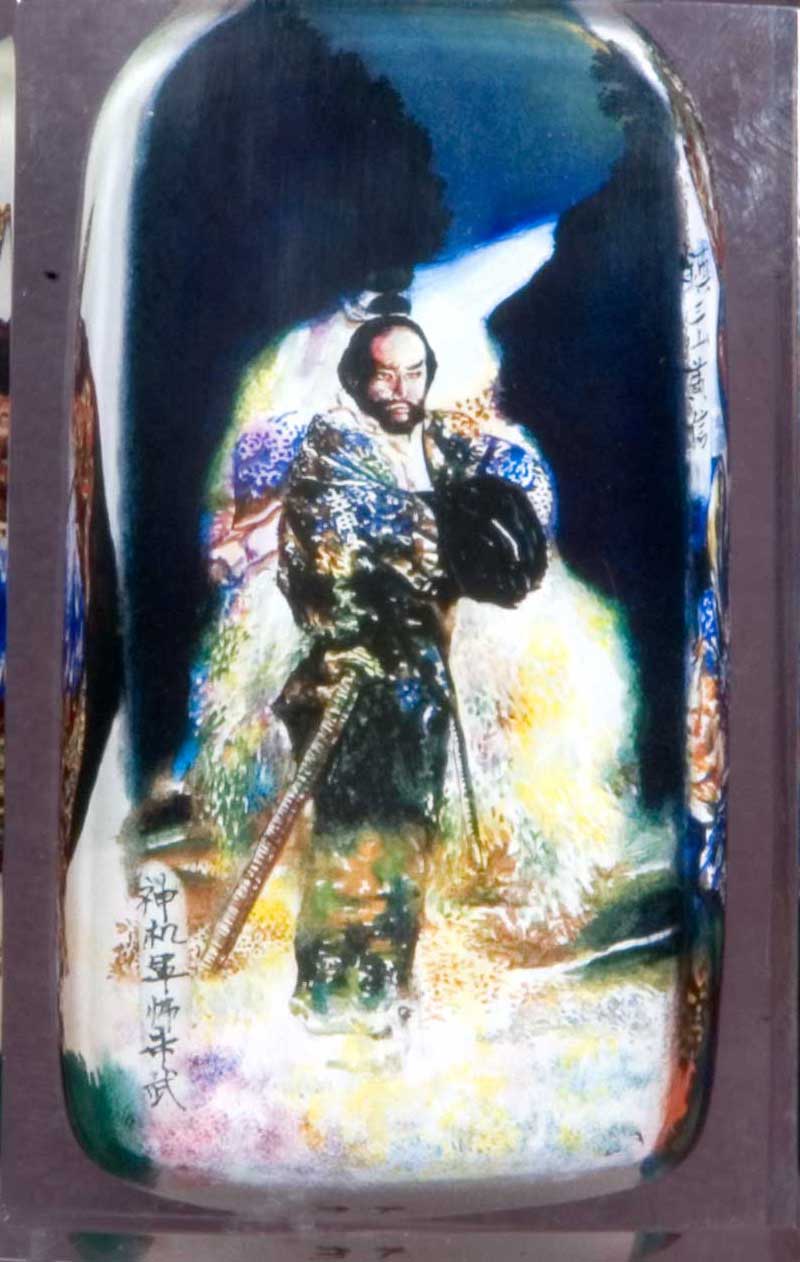 地魁星神机军师 朱武 Zhu Wu Zhu Wu was from Dingyuan, and became a bandit at Shaohua Mountain along with Chen Da and Yang Chun. He was born with blazing eyes, a handsome face and a long beard. He donned a Taoist's garments, and carried a fan similar to Zhuge Liang's. He used a pair of swords in combat, with a skill no other could match. Besides, he was also well-versed in the art of war and was full of stratagems, thus he earned the nickname 'Resourceful Strategist' (神机军师). Once, Chen Da ignored Zhu Wu's warnings and went to attack Shi Jin's village, but was caught by Shi Jin. Zhu Wu and Yang Chun went to Shi Jin and pleaded with him to release Chen Da. Shi Jin was moved and he released Chen. Later, all four of them became fast friends. Li Ji, a hunter in Shi Village, reported to the local government about Shi Jin and the three bandits. The government immediately sent troops to arrest the four men. The four heroes fought their way out of the village back to Shaohua Mountain. Later, Lu Zhishen wanted to invite the four heroes to join the Liangshan band, but found out that Shi Jin had been captured by Prefect He. Lu Zhishen was tricked into the prefect's residence and also caught. Zhu Wu notified the Liangshan heroes, who came to rescue Lu Zhishen and Shi Jin. Zhu Wu then followed the heroes back to Liangshan, and became one of the 72 Earthly Fiends. Zhu Wu became one of the key strategists of the Liangshan band. He followed the heroes on their campaigns against the Liao Tartars and southern rebels. He was one of the few lucky heroes to have survived the campaigns. After that, he refused to return to the capital city for his reward, so he followed Pan Rui and Gongsun Sheng to practise Taoism, till the day he died. Information from Wikipedia. Bottle painting by Li Yaming |